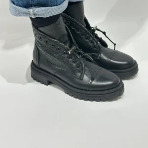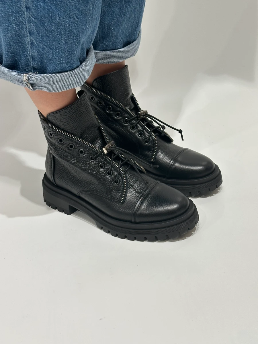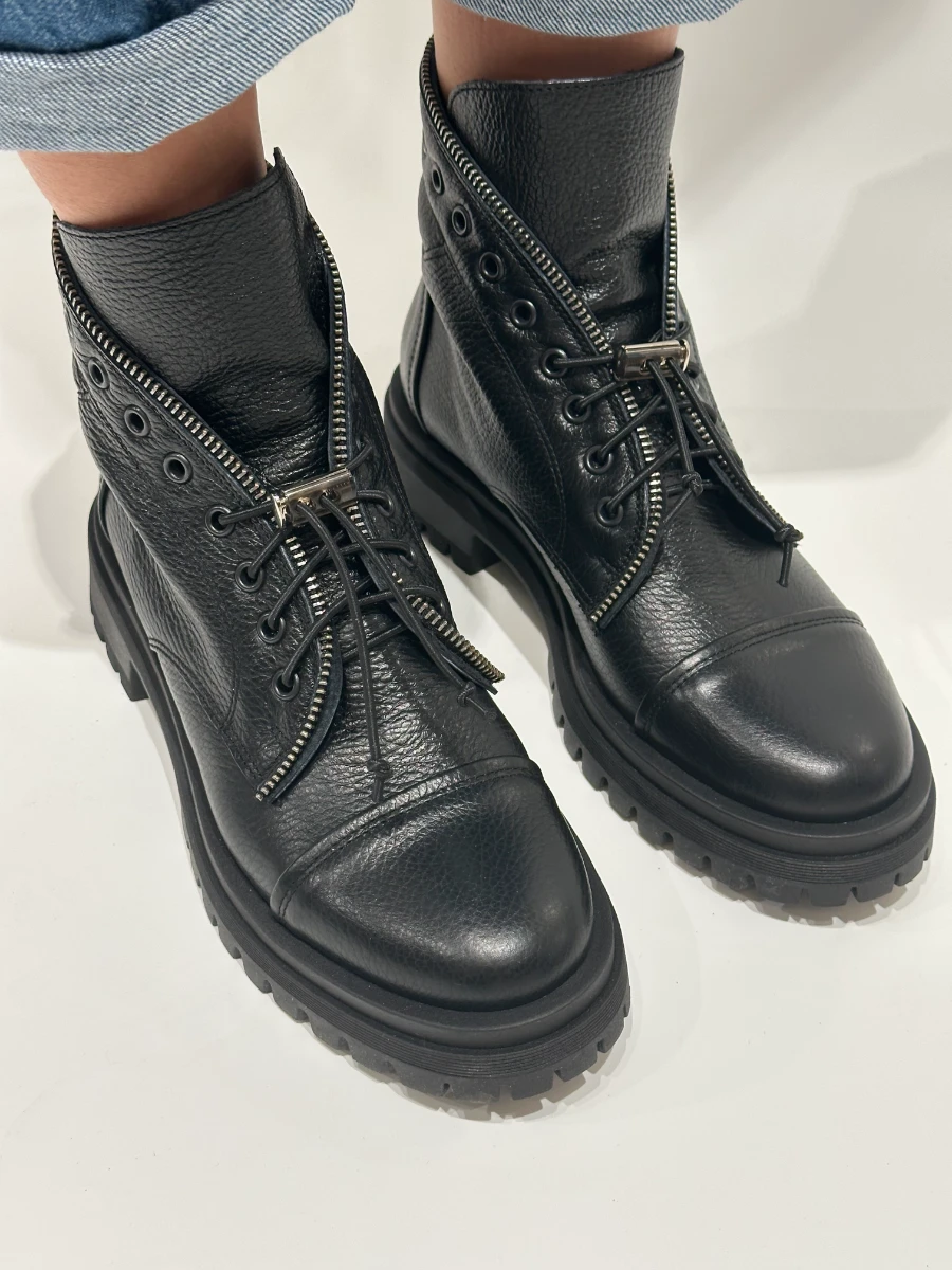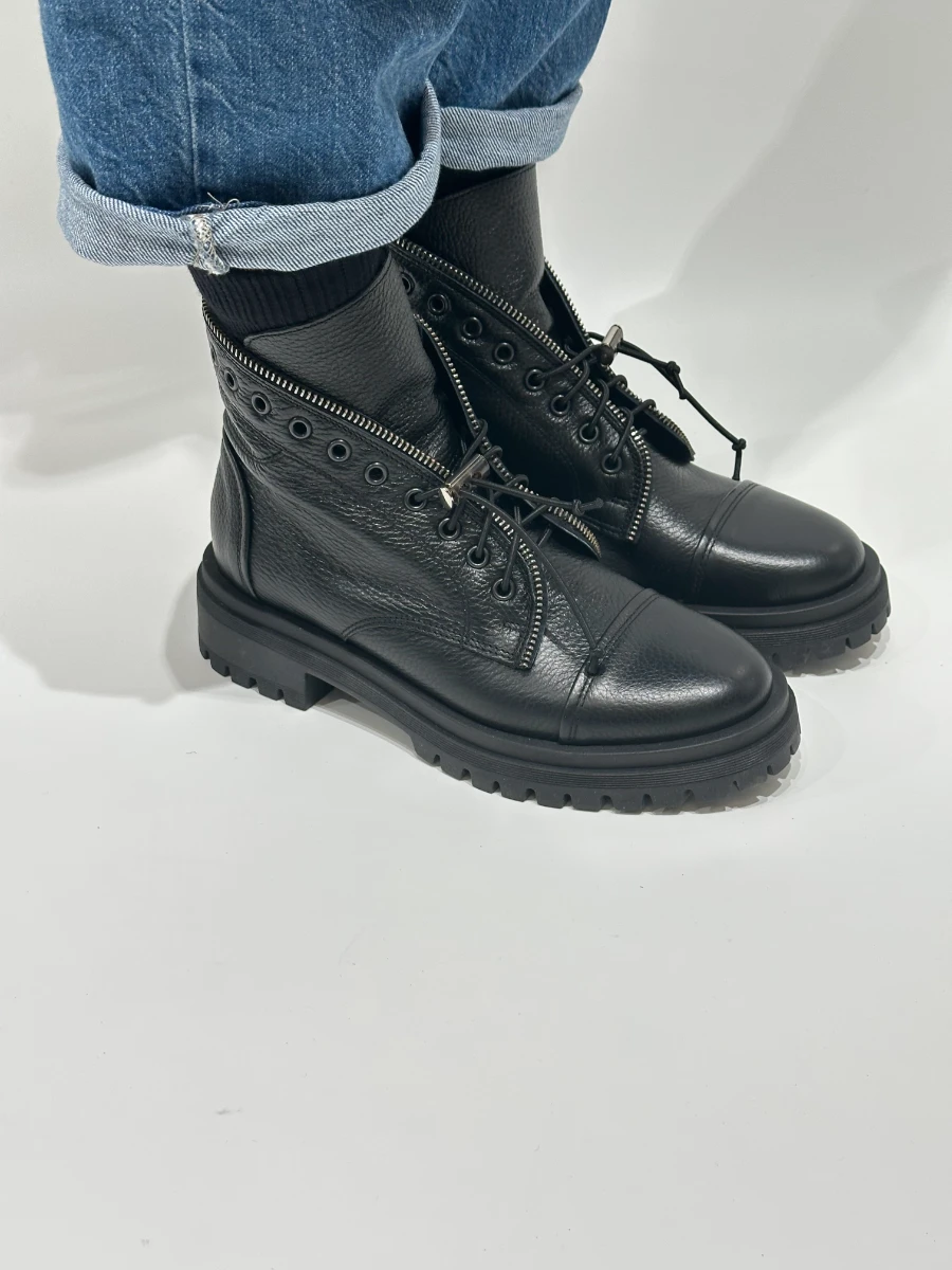 Anfibio in pelle nera con doppia cerniera e coulisse