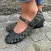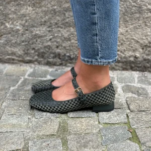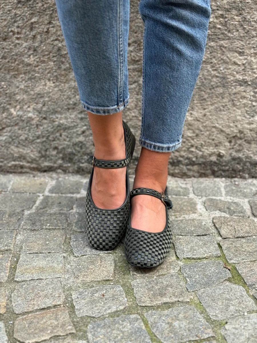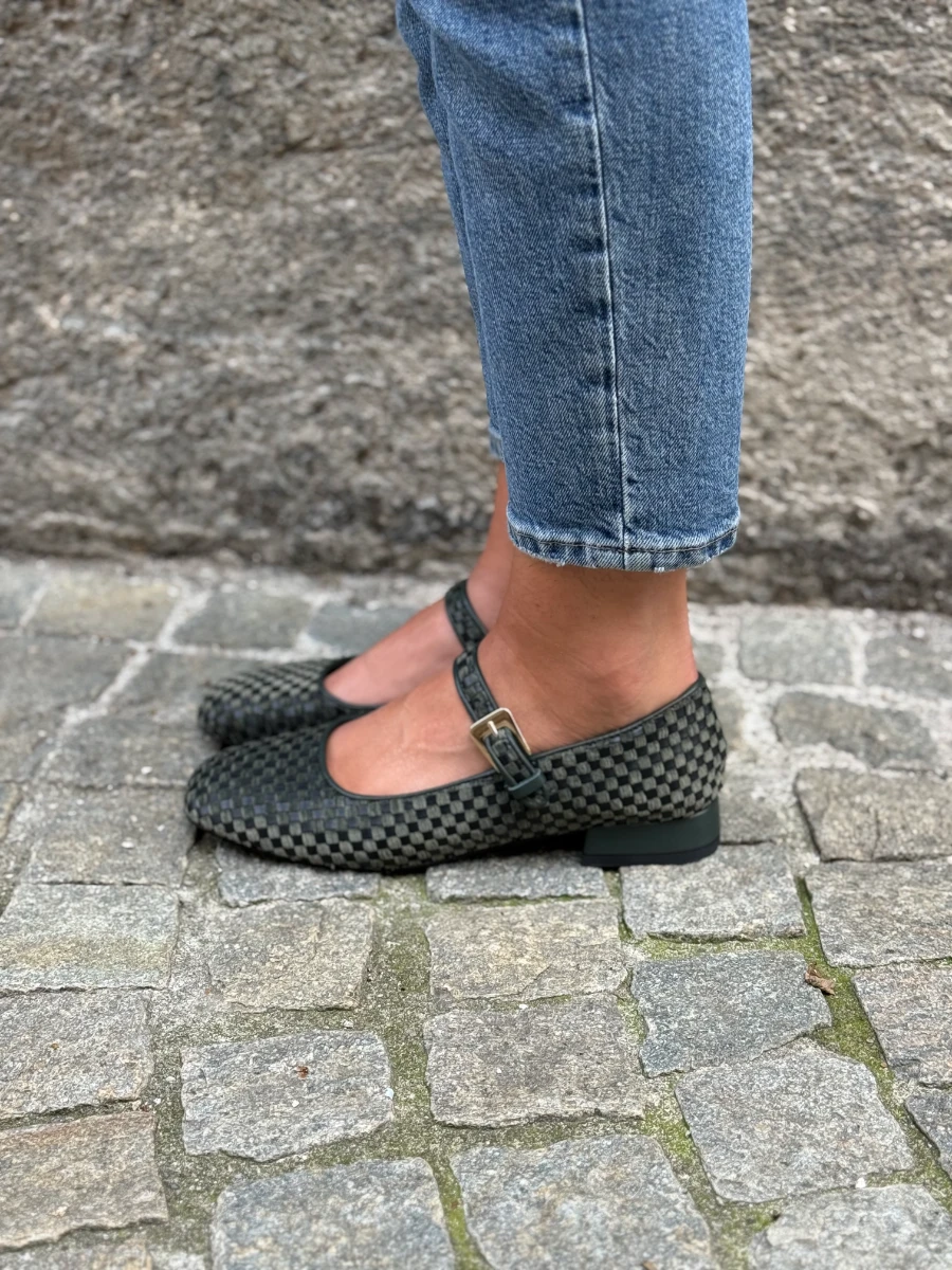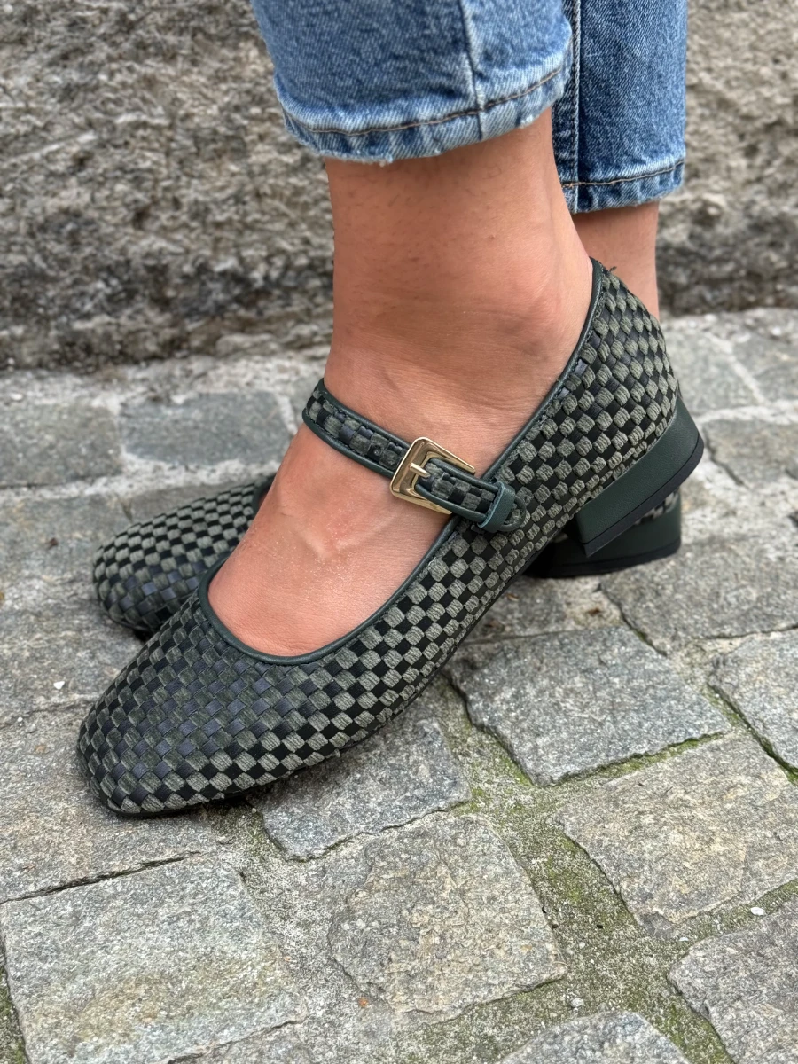 Ballerina in velluto e pelle verde.