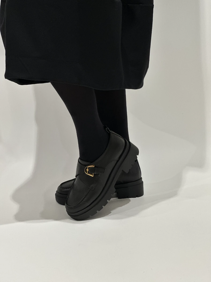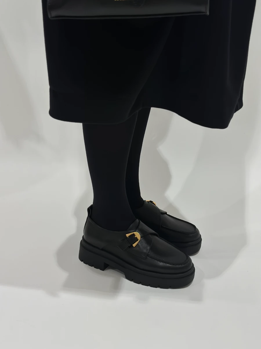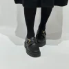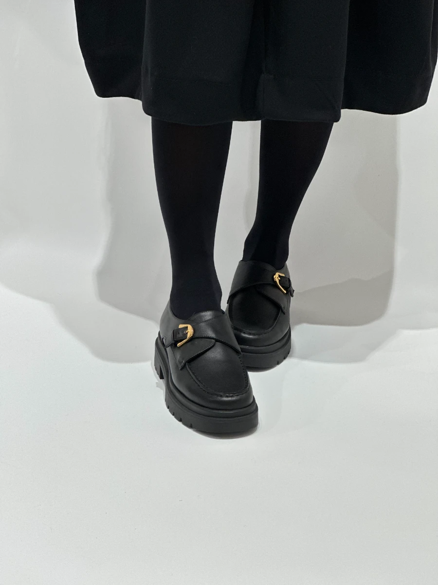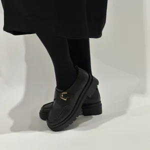Mocassino in pelle nera con fibbia color oro