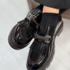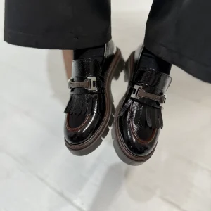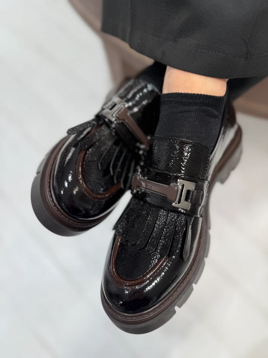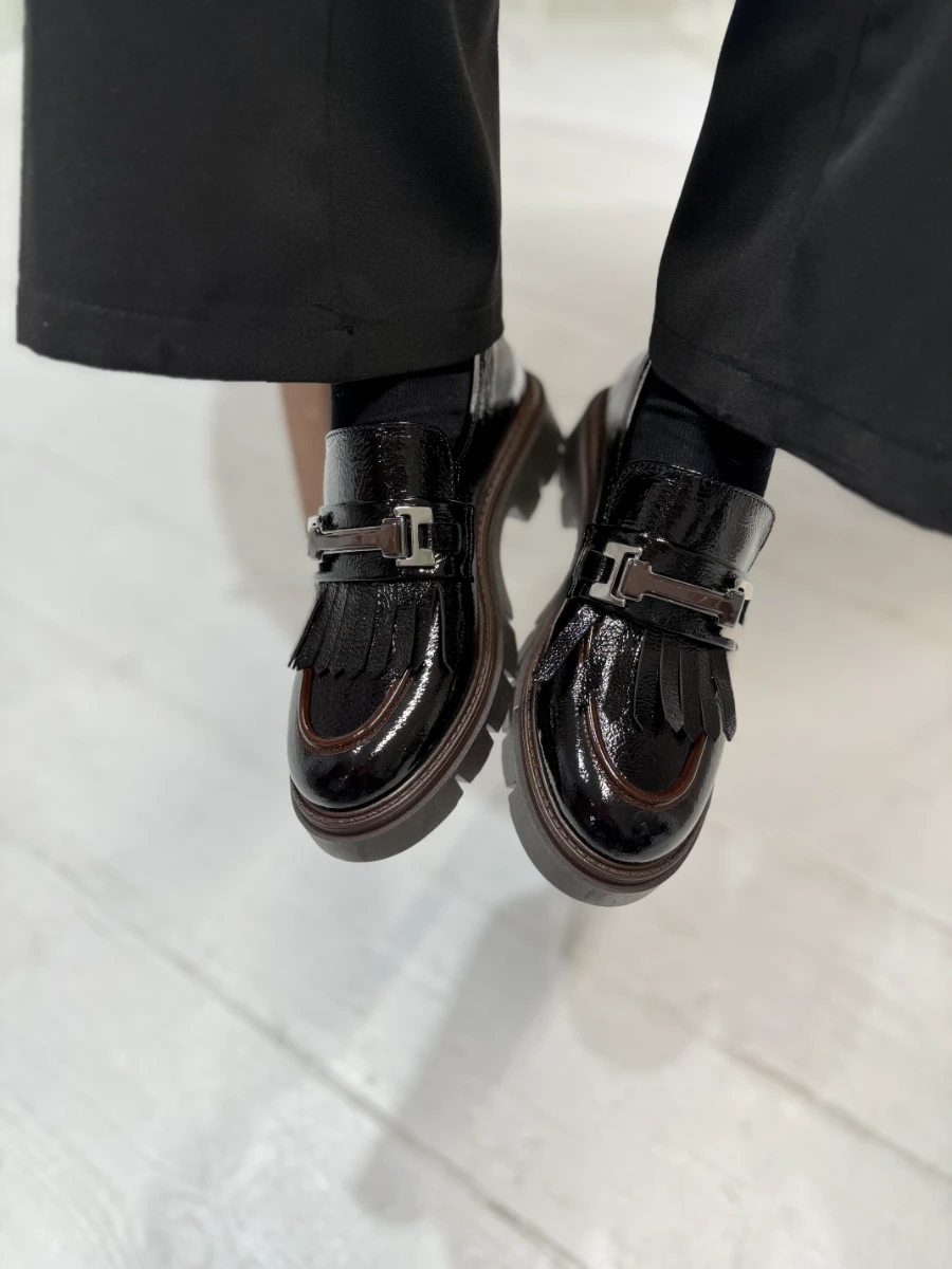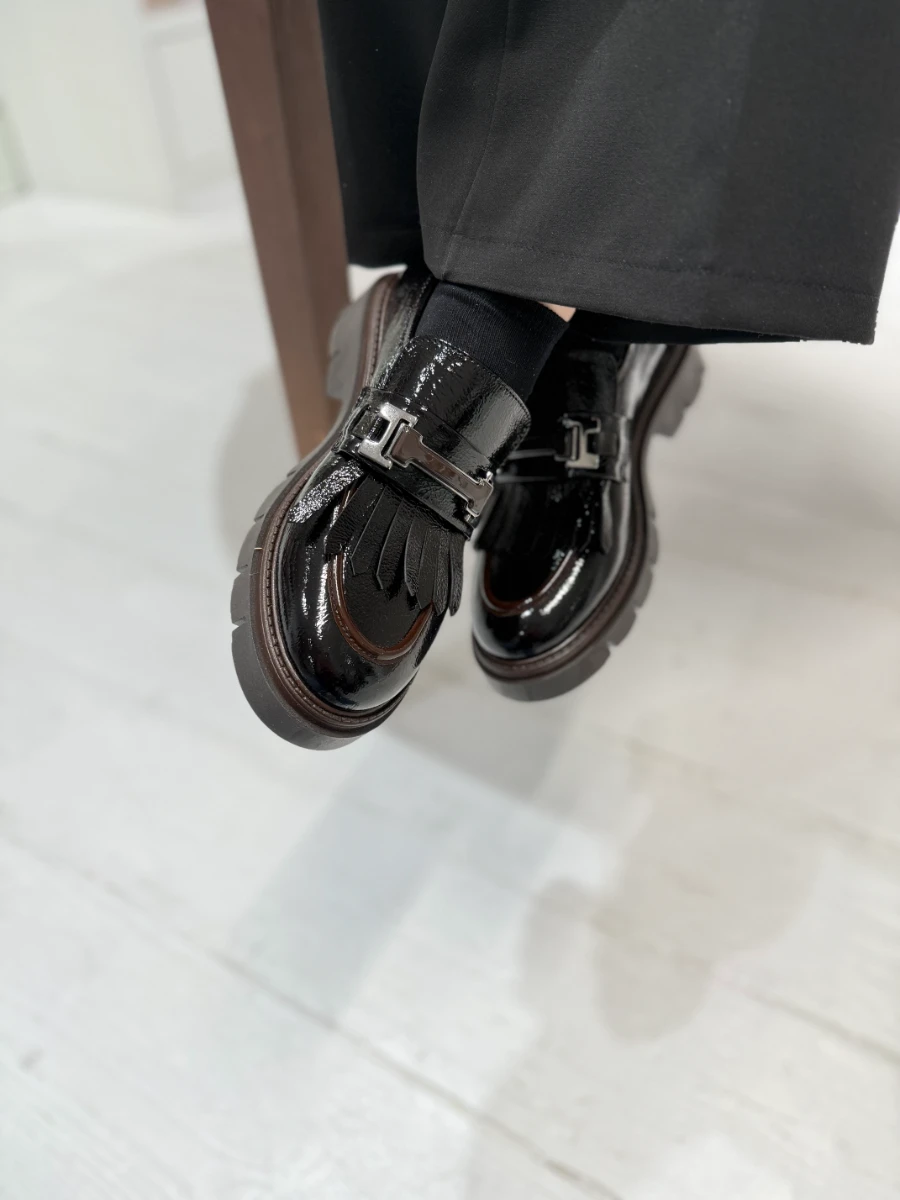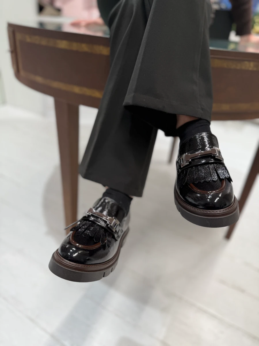 Mocassino in vernice nera con dettagli marrone, frangia  e carrarmato