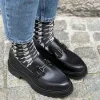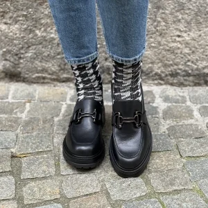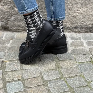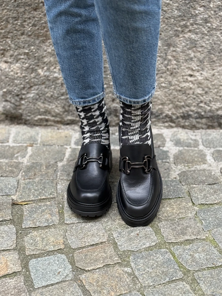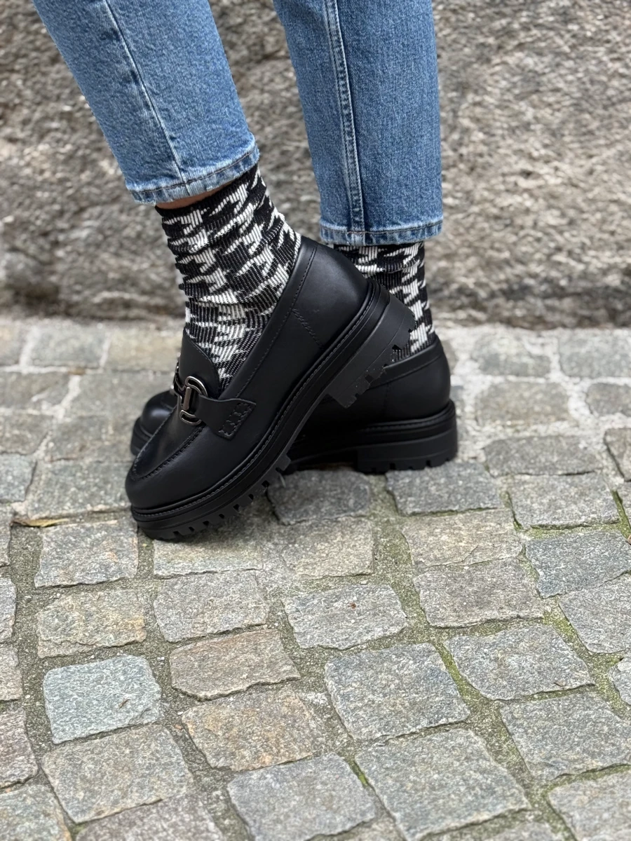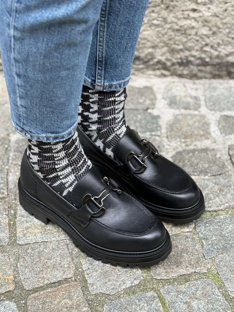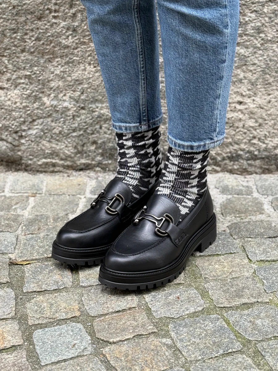 Mocassino in pelle nera con carrarmato e dettaglio in metallo.