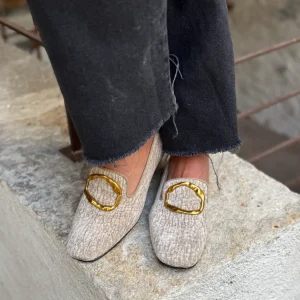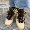 Scarponcino in pelle bottalata beige e linguetta in cavallino maculato.